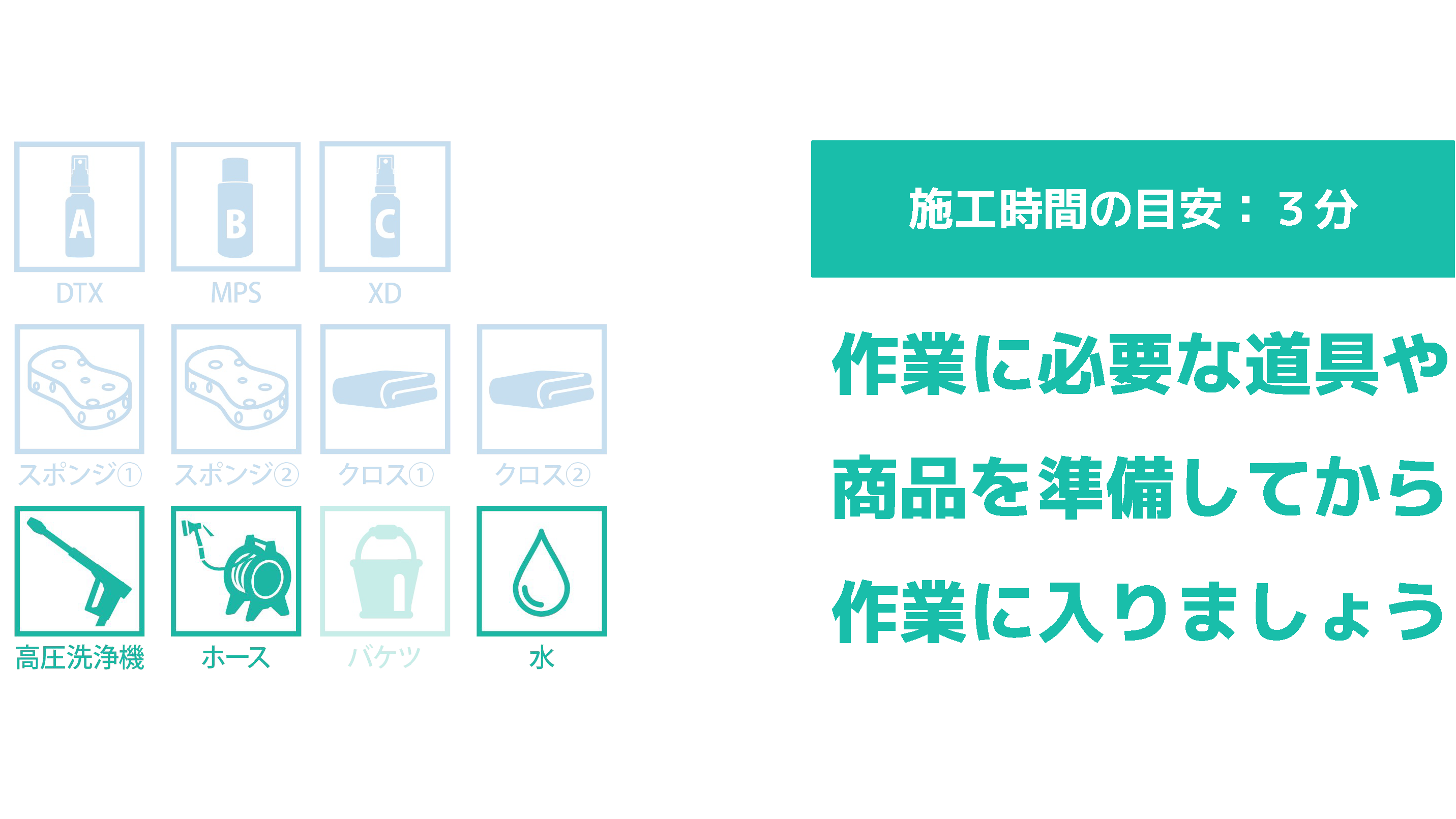 前工程で塗布したDTXを流していきましょう。十分な水で濯ぎながら、撥水が残る部分を同時にチェックすることで処理が甘い部分を発見できます。処理が甘い部分を発見したら、その部分だけ再度DTXを塗布してください。