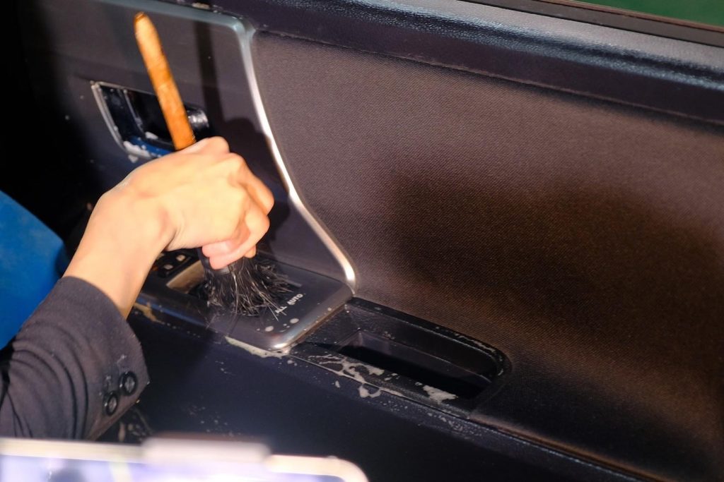 スイッチ部分やエアコンの吹出し口など、細かい部分はブラシやスポンジを小さくカットして塗布します。