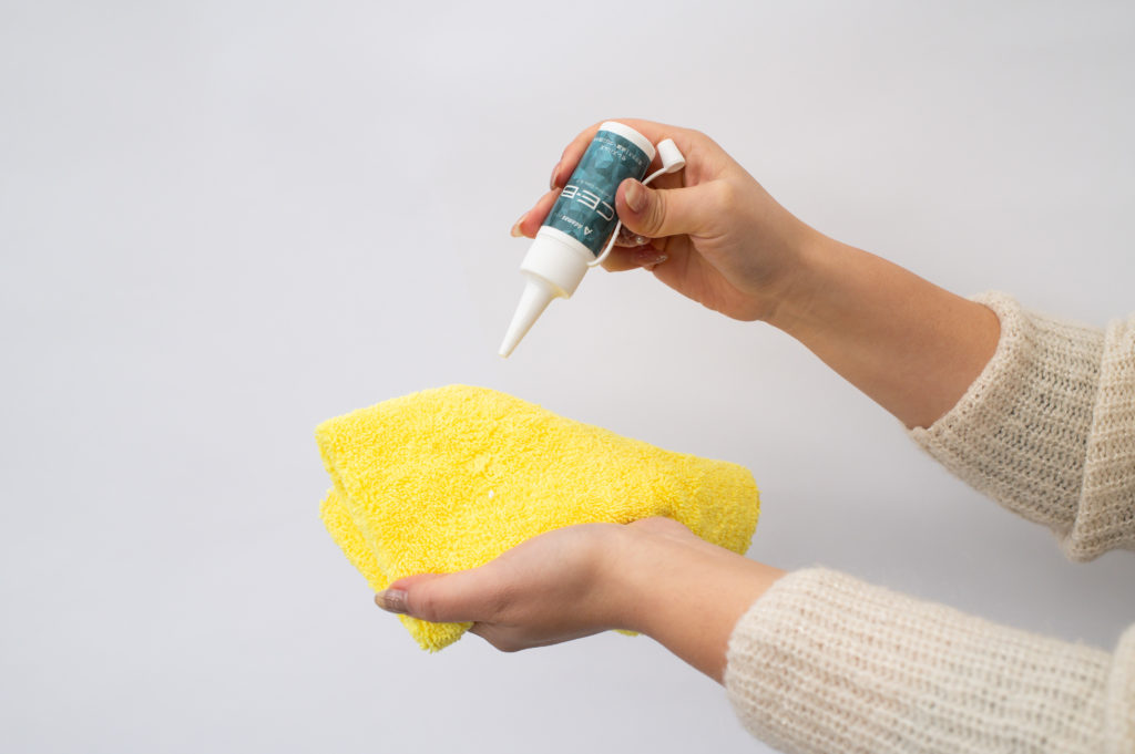 マイクロファイバークロスを水で濡らして絞ったあと、「CE-B ceres balus ガラス研磨剤」を付けます。