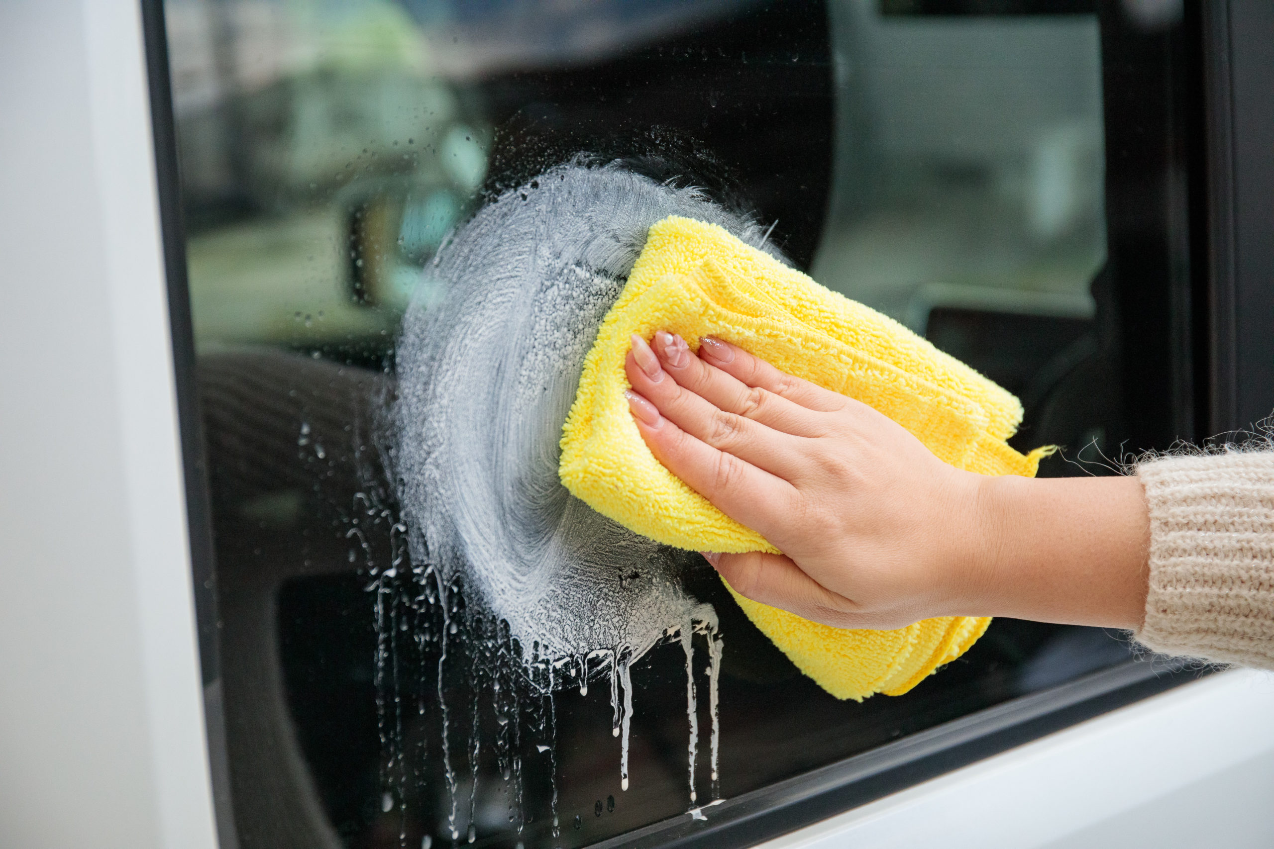 洗車後、ガラスに付着した水滴を軽くを拭き取ります。