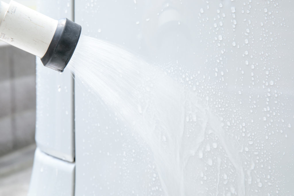 水で洗い流し、最後に中性または弱アルカリ洗剤やカーシャンプーにて中和のための洗浄を行い、よく洗い流す。