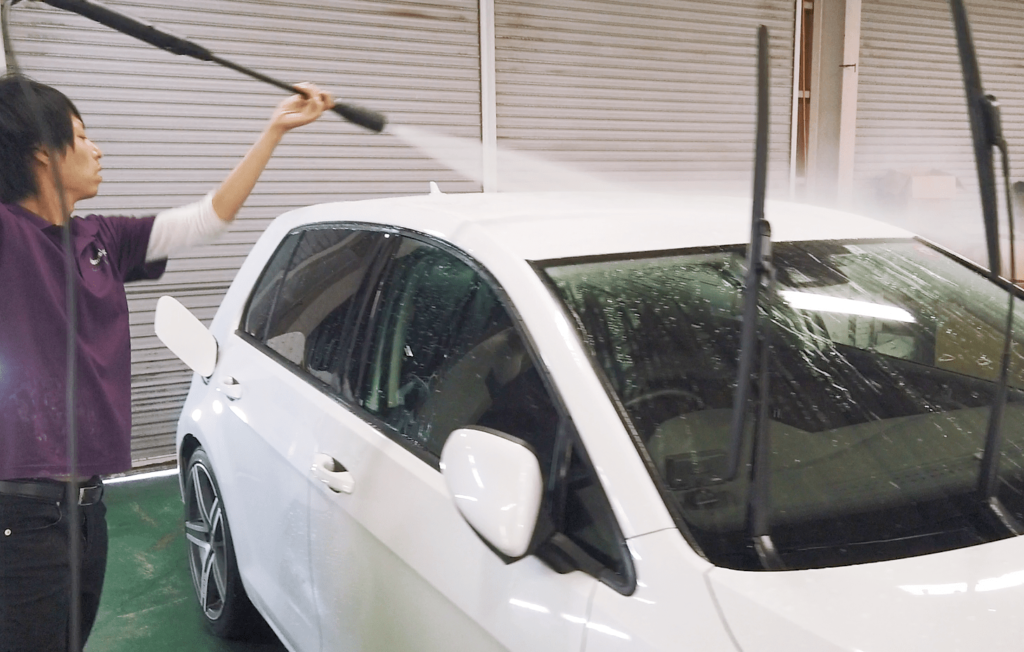 洗車後、たっぷりの水で泡がなくなるまで注ぎ、 拭き上げ用クロスで水分を拭き上げて完了です。