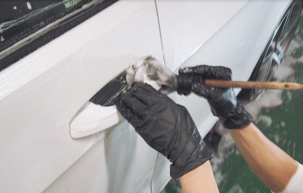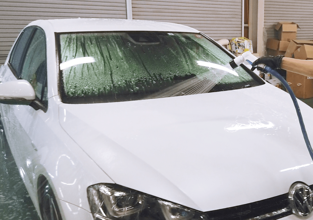 ボディに水が残っている状態で、洗車スポンジに適量つけて洗う or ケルヒャー高圧洗浄機でシャンプーを吹きかけてスポンジで洗います。
